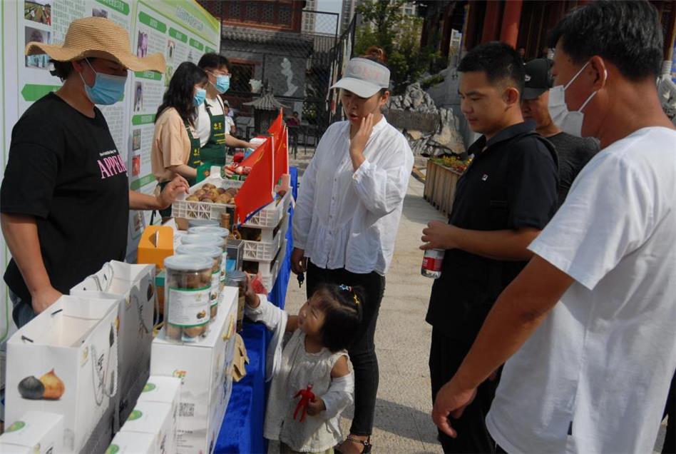 豐收節(jié)上曬豐收,豐收節(jié)里慶豐收。除了好看的歌舞表演外,現(xiàn)場展位上的特色農(nóng)產(chǎn)品同樣奪人眼球。廣場西側(cè)展區(qū)附近圍滿了群眾,有藍(lán)村大米、鰲山衛(wèi)蝦米、湍灣黑蒜等,游客們邊看邊買,現(xiàn)場一片熱鬧景象